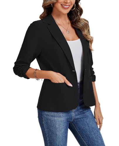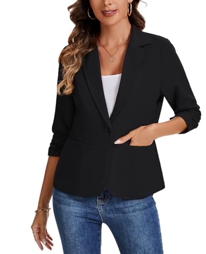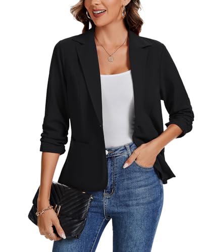 HOT ! MINTLIMIT Ruched 3/4 Sleeve Blazer Jackets for Women Button Front Notch Lapel Casual Lightweight Blazers with Pockets (Black, Size S)