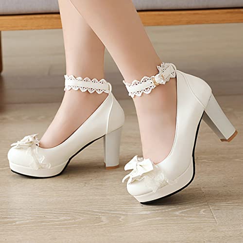 UniqueStride Womens Platform Chunky Block High Heel Pumps Ankle Strap Sweet Bow Buckle Closed Toe Shoes 4