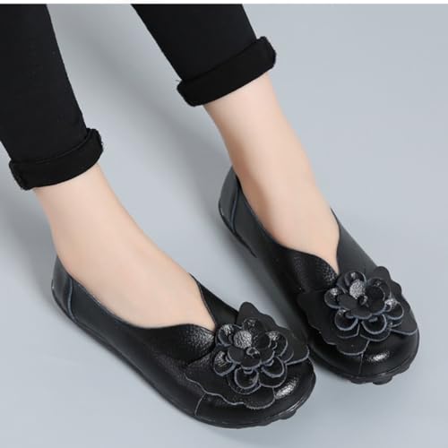 Women Concise Flower Flats Black Shoes,Leather Fashion Woman Flat with Flowers Ladies Casual Shoes, Round Toe Flowers Low Top Walking Slip On 6