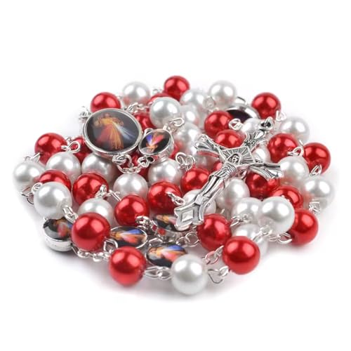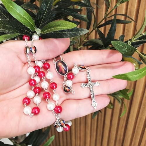 • 8mm Red and White Glass Beads CATHOLIC ROSARY NECKLACE Divine Mercy Medal Connectors & Cross Crucifix in a Gift Box