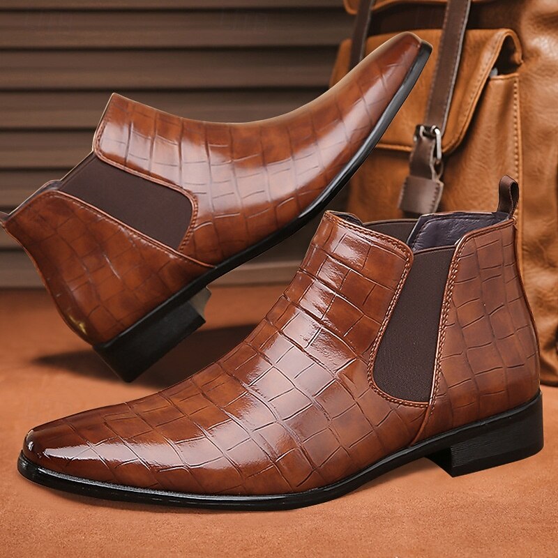 Men's Tan Genuine Faux Leather Chelsea Boots with Elastic Side Panels and Smooth Finish, Elegant Dress Ankle Boots for Business, Parties and Formal Occasions 24