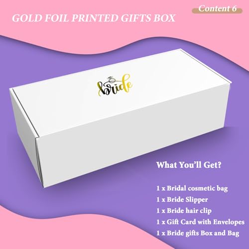 • Comprehensive Bridal Gift Set: Includes a comfy bride slipper, practical bride hair claw clip, spacious bride cosmetic bag, and elegant gift box with a 5*7" blank greeting card and a white envelope.
