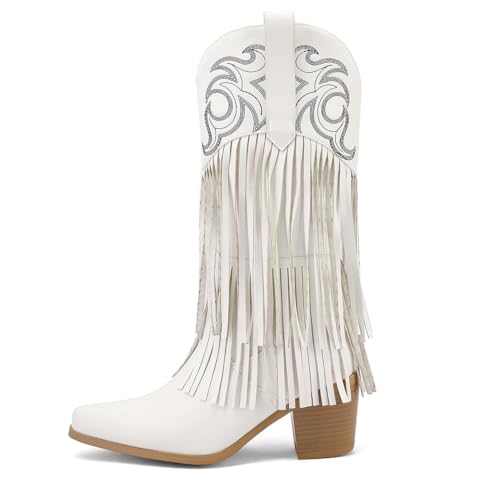 MRKEWUNEY Fringe Cowboy Boots for Women Knee High Western Boots Pointy Toe Block Heel Tassel Cowgirls Boots 6