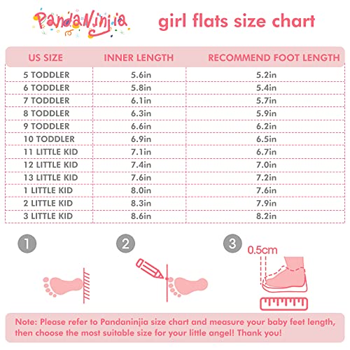 • 💓HOW TO CHOOSE GIRLS BALLET FLATS SIZE- PANDANINJIA gold shoes for girls are true to size. We offer our size chart in the pictures to ensure that you could choose a perfect princess shoe size for your little kid. Please measure your little girl's feet length and refer to our size chart to get the right size.Please choicing the shoes size: 6/7/8/9/10/11/12/13/1/2/3.