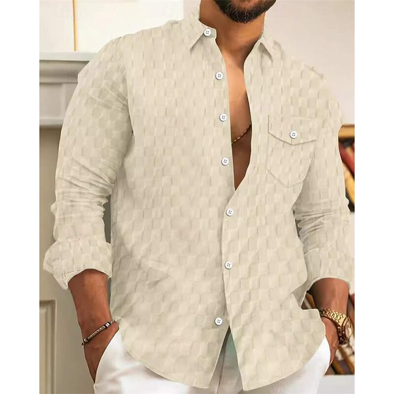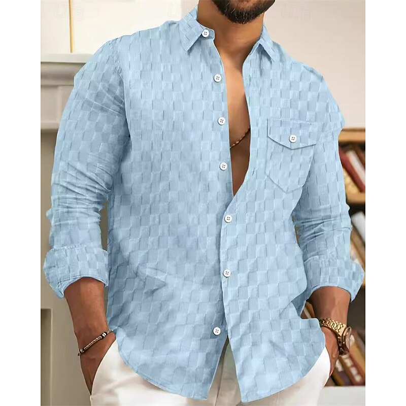 Highlights [Fabric:] Crafted from high-quality polyester, this men’s shirt offers a lightweight and breathable feel, perfect for the warmer seasons of spring and fall. The material provides comfort and durability, making it a great addition to any wardrobe. [Fit:] This shirt boasts a comfortable regular fit with a stylish, laid-back appeal, suitable for various body types. The long sleeves can be rolled up for a more relaxed approach, adding versatility to your style. [Design Highlights:] Featuring a plain yet sophisticated jacquard pattern, this button-down shirt includes a classic lapel collar and a functional front pocket with a buttoned flap. The subtle texture of the fabric enhances its elegant look, while the shirt's design ensures it is both fashionable and comfortable. [Occasions:] Ideal for vacations, holidays, casual daily wear, and street style, this shirt seamlessly transitions from beachwear to casual outings. Its versatile design makes it suitable for Hawaiian holidays and other leisure events, ensuring you look stylish in any setting. [Size Range:] Available in sizes S, M, L, XL, 2XL, and 3XL, making it easy to find the perfect fit for your body type. Select from an array of colors like White, Black, Sky Blue, Apricot, Light Green, and Dark Green to match your personal style preferences.
