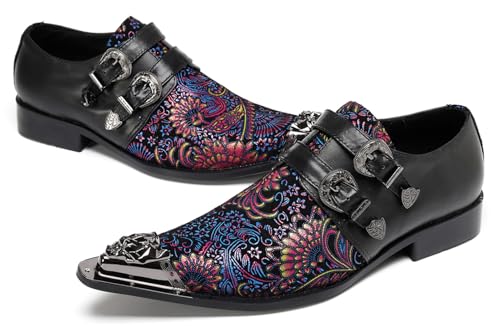 HOT ! Santimon Men’s Genuine Leather Double Monk Strap Loafers Shoes, Stylish Fashion Paisley Print Mocasines with Metal Toe for Party Wedding Disco
