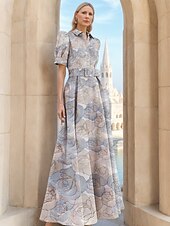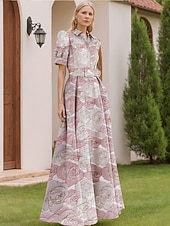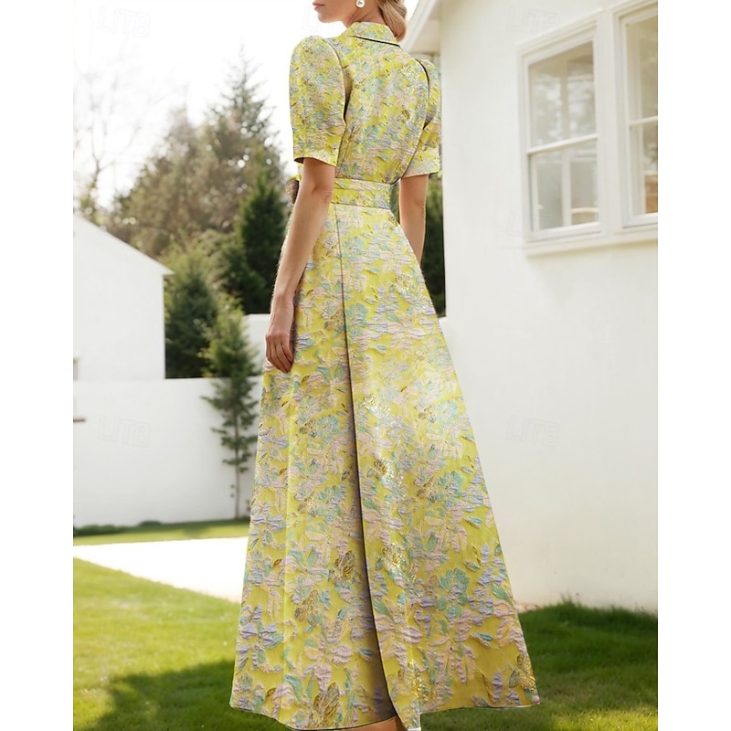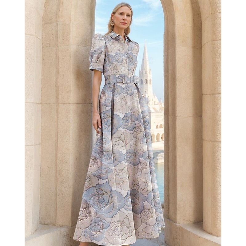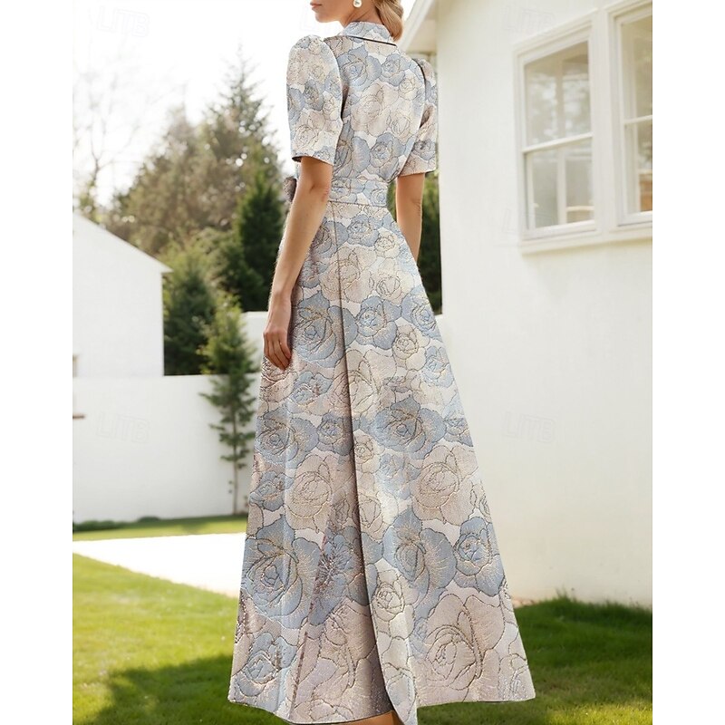 More information about Floral Jacquard A-Line Evening Gown Elegant Dress Formal Wedding Floor Length Short Sleeve Shirt Collar Nylon with Floral Print Slit Pocket Wedding Guest Dress