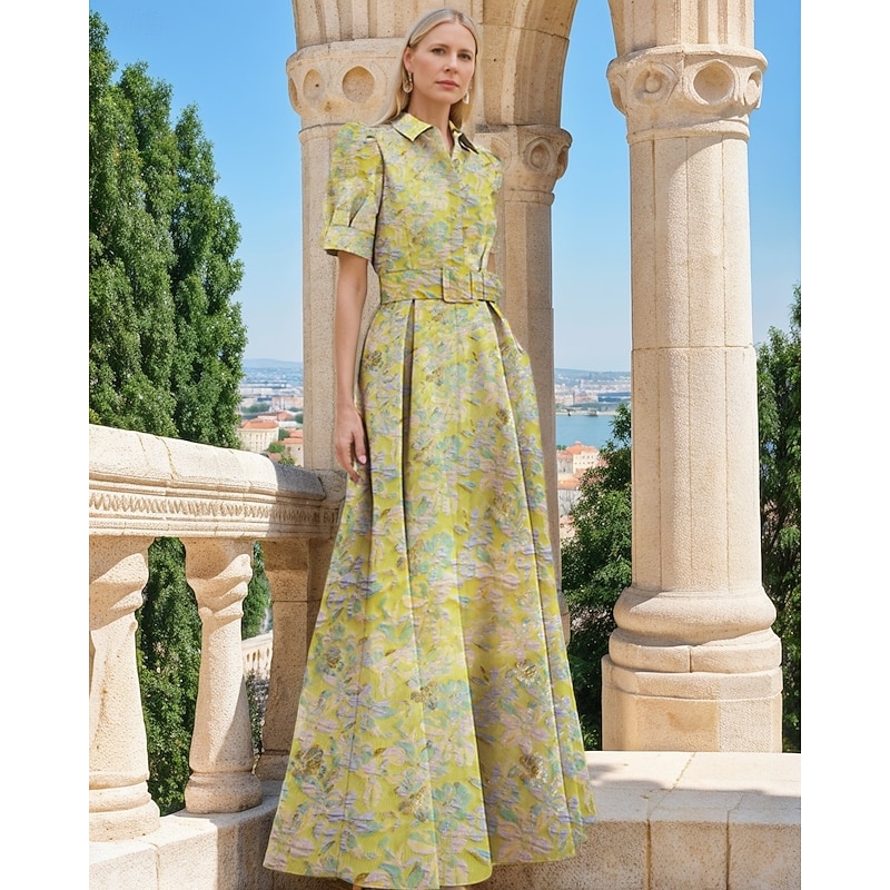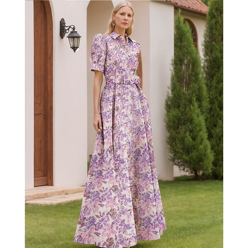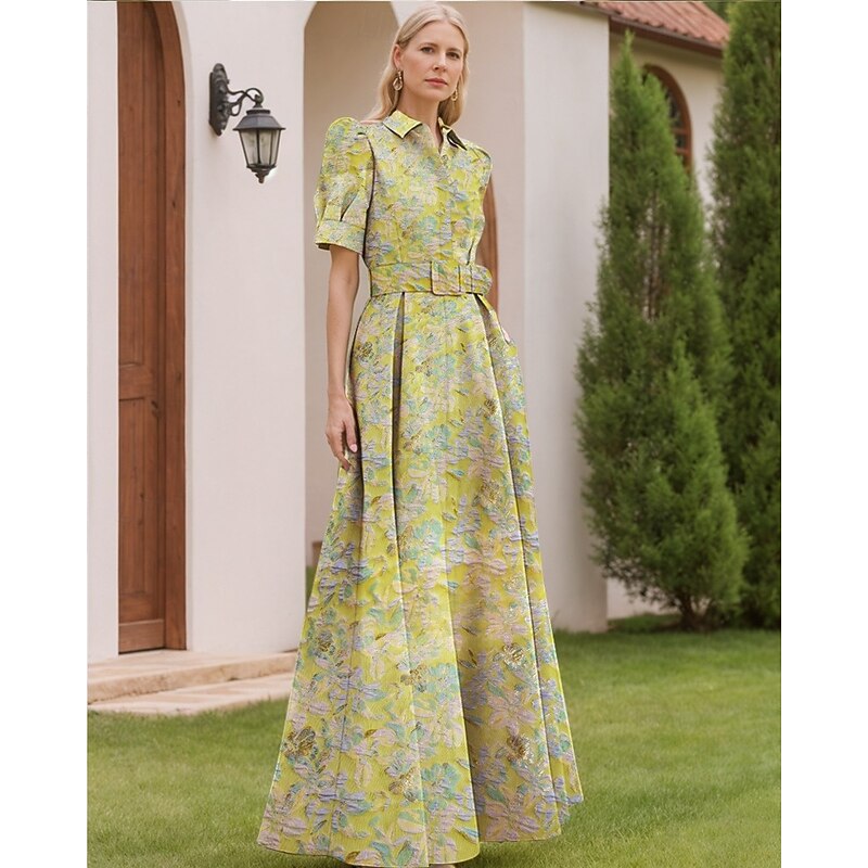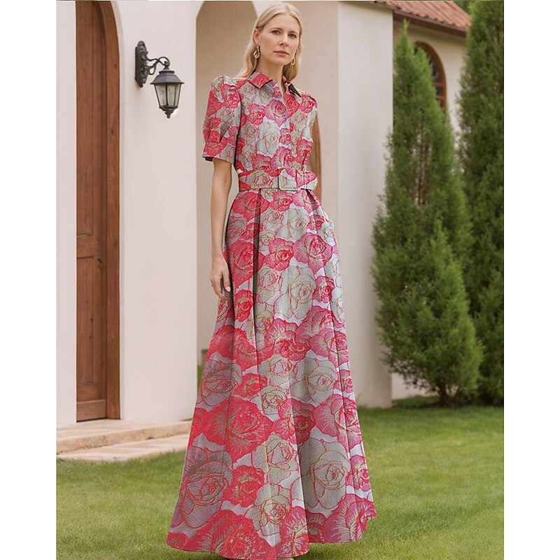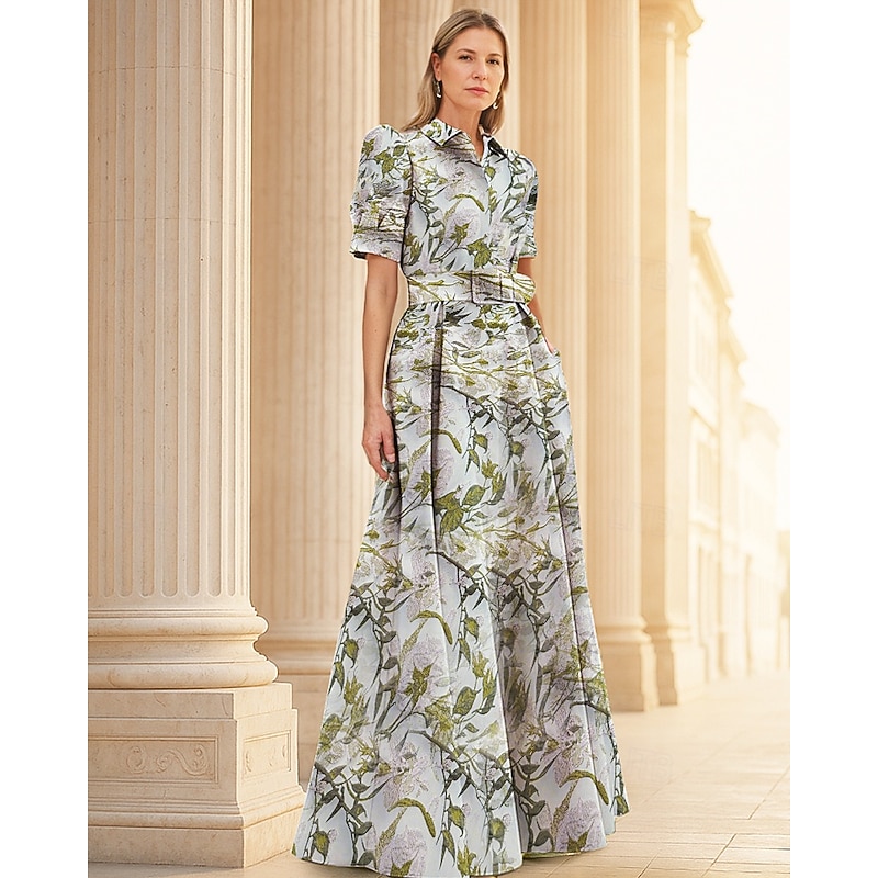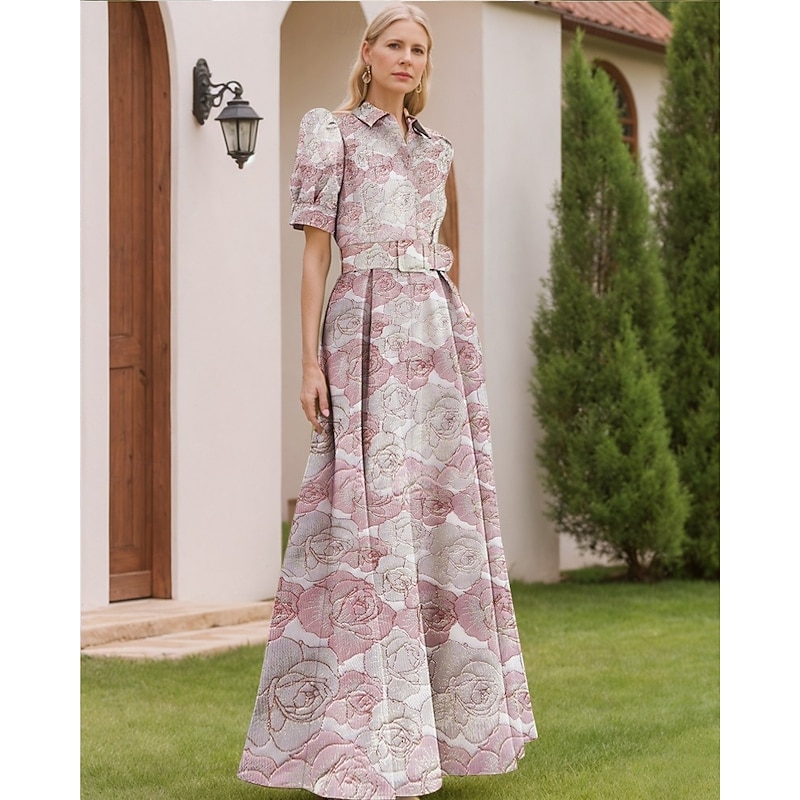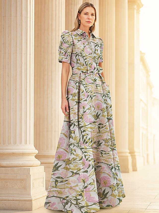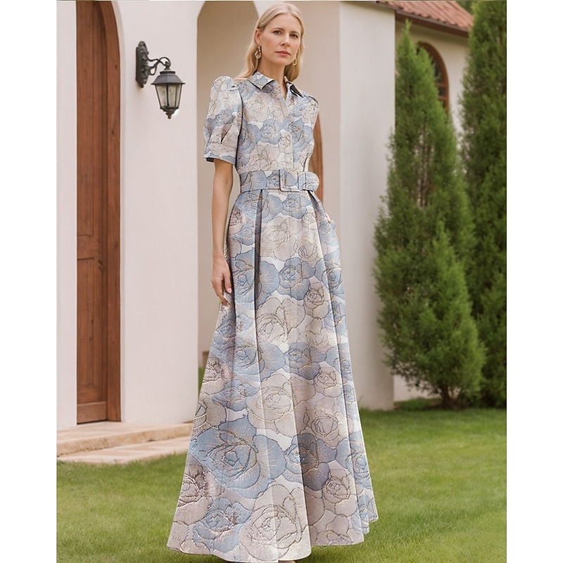 Floral Jacquard A-Line Evening Gown Elegant Dress Formal Wedding Floor Length Short Sleeve Shirt Collar Nylon with Floral Print Slit Pocket Wedding Guest Dress 20