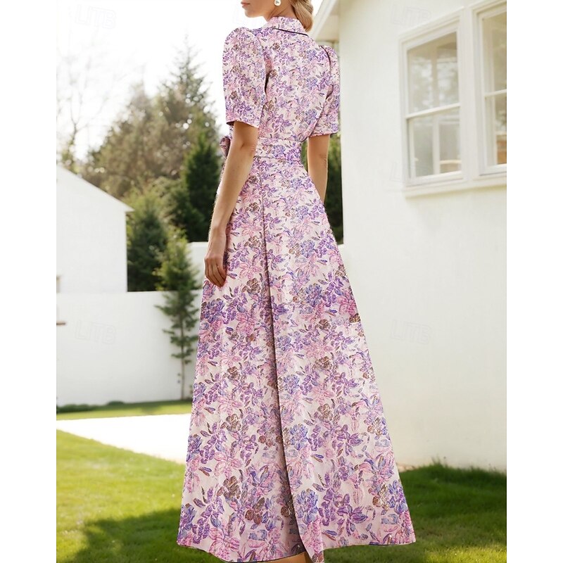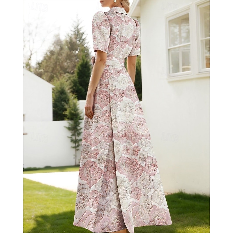 Floral Jacquard A-Line Evening Gown Elegant Dress Formal Wedding Floor Length Short Sleeve Shirt Collar Nylon with Floral Print Slit Pocket Wedding Guest Dress 4