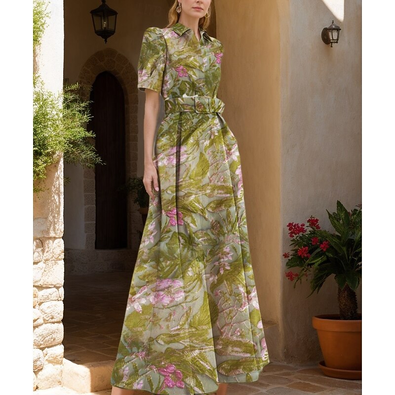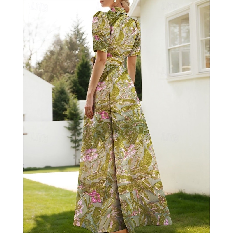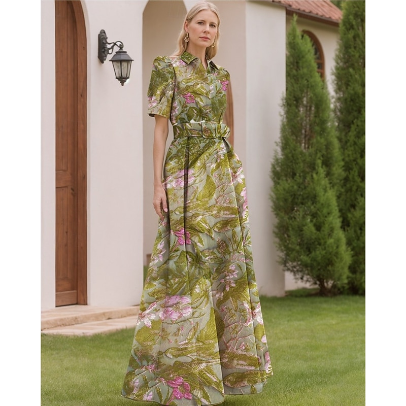 Floral Jacquard A-Line Evening Gown Elegant Dress Formal Wedding Floor Length Short Sleeve Shirt Collar Nylon with Floral Print Slit Pocket Wedding Guest Dress 1