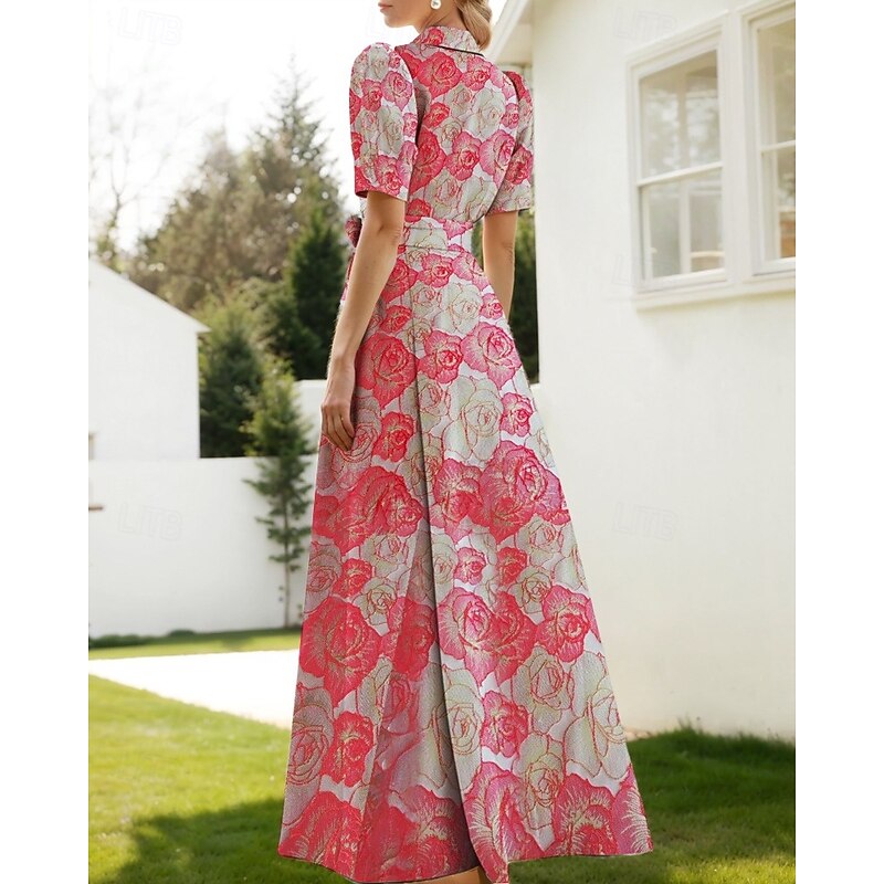 Floral Jacquard A-Line Evening Gown Elegant Dress Formal Wedding Floor Length Short Sleeve Shirt Collar Nylon with Floral Print Slit Pocket Wedding Guest Dress 5