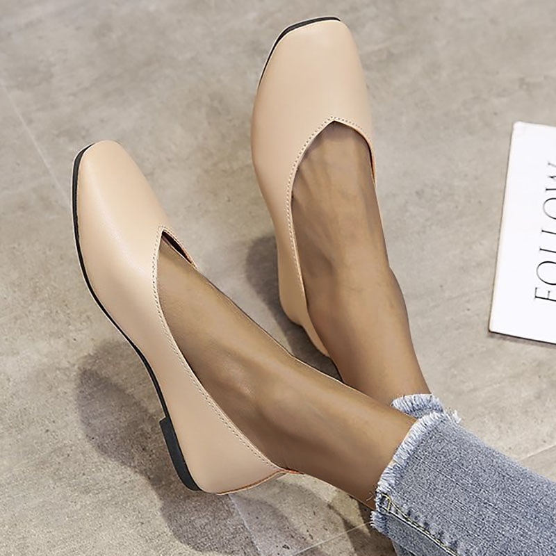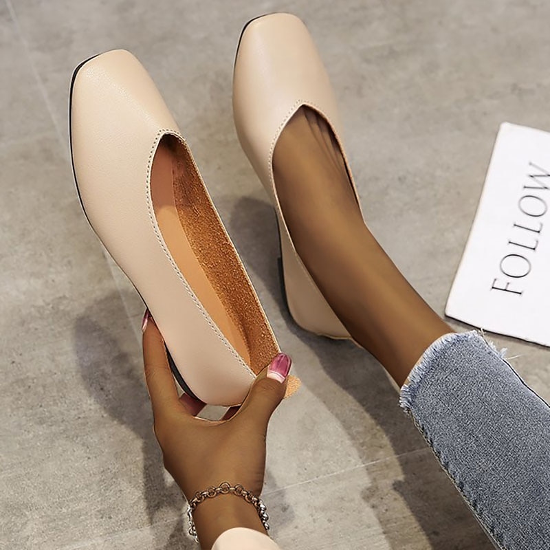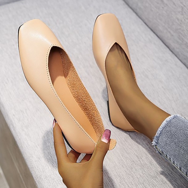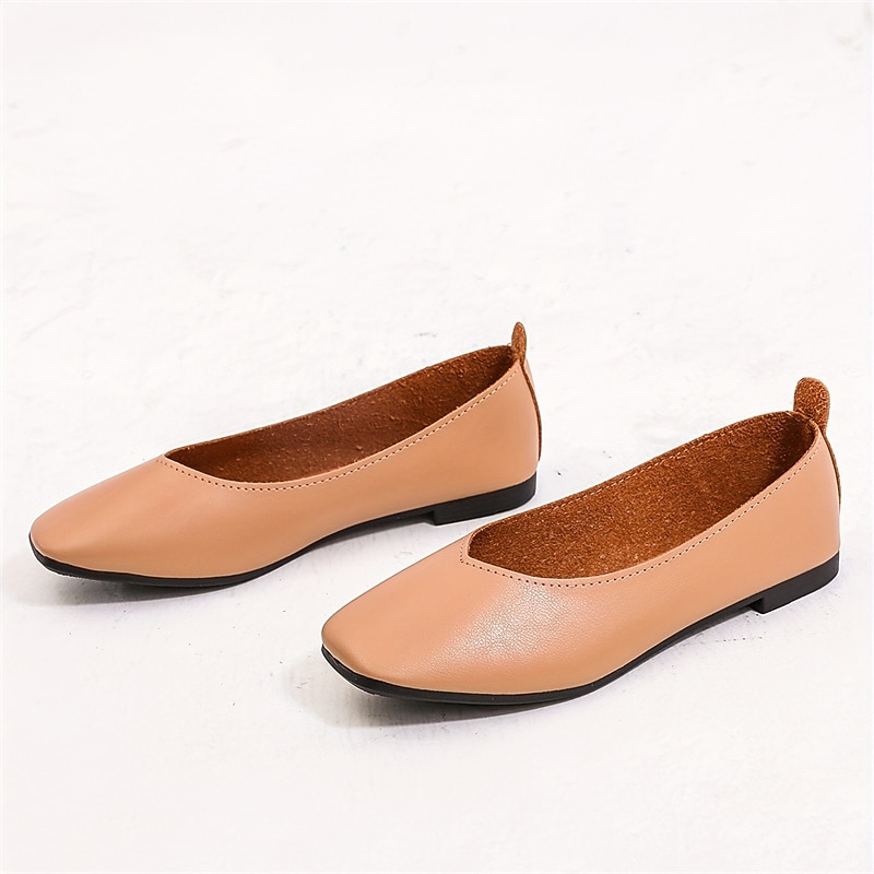 Highlights [Fabric and Construction] : These women's ballet flats are crafted from high-quality faux leather, offering a smooth and sophisticated finish. The durable rubber sole ensures flexibility and comfort, providing excellent shock absorption and traction for everyday wear. [Shape and Style] : Featuring a low heel and square toe, these slip-on flats embody a vintage yet minimalist design, perfect for both casual and professional settings. The overall structure promises a timeless look while maintaining modern comfort. [Design Highlights] : The minimalist style is enhanced by a solid color palette, available in shades like almond, black, white, beige, and green. The shoes are designed with a loafer closure type, which offers ease of wear and removal, ideal for the on-the-go lifestyle. [Occasions] : Perfect for daily wear and outdoor activities, these flats are an excellent choice for the spring, summer, and fall seasons. Whether you're headed to the office or a casual outing, these shoes offer comfort and style that seamlessly complement a variety of outfits. [Size Range] : Available in a wide range of sizes, from US5.5 to US8.5 / EU35 to EU39 / UK3.5 to UK6.5, these flats ensure a fitting option for different preferences, providing a tailored fit for various foot shapes.