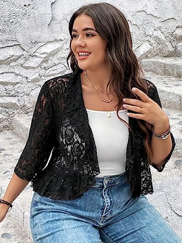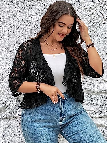 WDIRARA Women's Plus Size Open Front Ruffle Hem Crop Lace Jacket 3/4 Sleeve Sheer Outerwear 3
