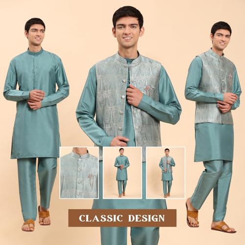 • Fabric: Kurta and Pant - Heavy Cotton, Jacket (Waistcoat) -Jacquard Silk | Type: Indian Kurta Set With Jacket | Pattern: Sequence | Length: Above Knee | Sleeve: Long Sleeve | Fit: Regular | Collar: Mandarin | Pocket: 2 Side Pocket