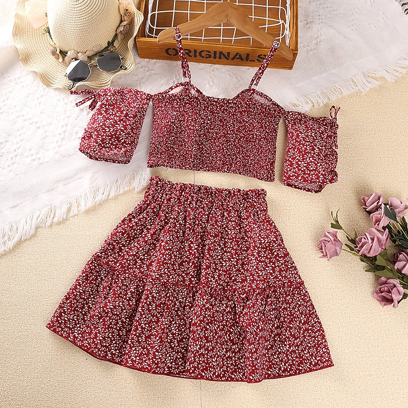 HOT ! 2 Pieces Kids Girls' Graphic Skirt & Shirt Set Short Sleeve Active School 7-13 Years Summer Red