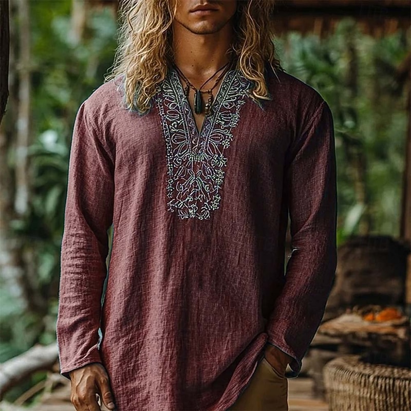 More information about Men's Shirt Linen Shirt Popover Shirt Summer Shirt Beach Wear Geometric Vacation Street Wine Navy Blue Blue Long Sleeve V Neck Summer Spring Clothing Apparel