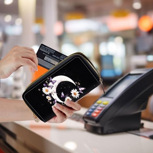 Wallet,Leather Long Wallet Suitable For Ladies And Teenagers - Detachable Wristband + RFID Travel Wallet With Card Slot - Moon Butterflies Daisies 1