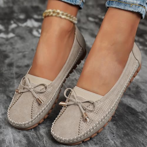 Curvahouse Orthopedic Shoes, Curvahouse Orthopedic Leather Shoes, Women Solid Color Retro Round Toe Dressy Slip-On Bow-Knot Flats Loafers Lightweight Anti-Slip Breathable 5