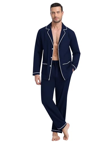 HOT ! MoFiz Mens Pajama Set Soft Cotton Button Down Notched Collar Pjs Long Sleeve 2 Piece Sleepwear Lounge Nightwear with Pocket