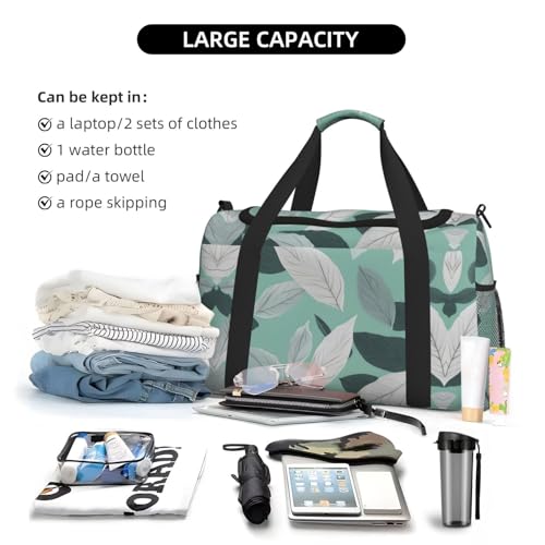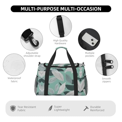 Tough Texture: Mint Gray Leaves print Travel Bag for Women is made of hardy twill, perfect for extensive travels or routine outings. The smooth and rugged nylon zippers and pulls enhance its functionality, promising easy access and a long service life.Large Interior: Mint Gray Leaves print Weekender Bag for Women in the dimension of 19.6x13x10.2 inches presents a sizable space. It can easily contain all necessities for a weekend trip, including clothes and toiletries, providing convenience.Strain Reliever: Mint Gray Leaves print Travel Duffle Bags for Women features thin pit webbing for enhanced durability and charm. Its padded handle cover wards off discomfort, serving as a reliable partner for all travels.Function Switcher: Mint Gray Leaves print Gym Bag for Women toggles between being a chic weekend essential and a practical sports accessory. It's perfect for short trips, a game of tennis, or any户外活动, always ready to meet your changing demands.Versatile Pick: Mint Gray Leaves print Travel Bag for Women caters to various needs. It accommodates clothing for travel, sports gear for fitness, and is handy for picnics or weekend getaways. An essential for a dynamic lifestyle. Perfect for everyday use. superior materials and excellent craftsmanship ensure long-lasting durability.