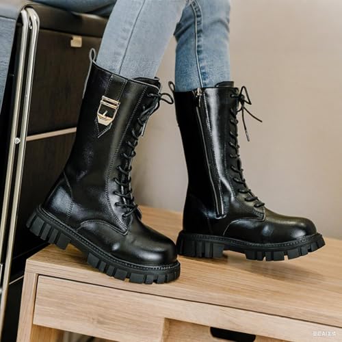 Girl's Knee High Boots Lace Up Side Zipper Combat Boots, Mid Calf Riding Boots PU Leather Punk Goth Lug Sole Boot for Girl Toddler/Kid 4-11 Years,Non Slip Riding Boots Lug Sole Chunky Heels Shoes 6