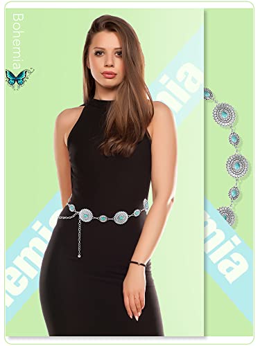 HOT ! Epakh Concho Chain Belt for Women Western Silver Oval Turquoise Adjustable Metal Waist Belts Dress Jeans Country Concert(Classic Style,2 Pieces)