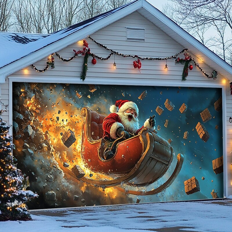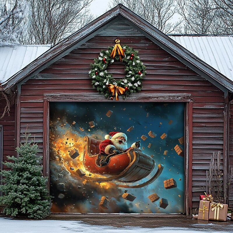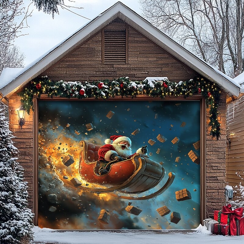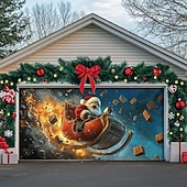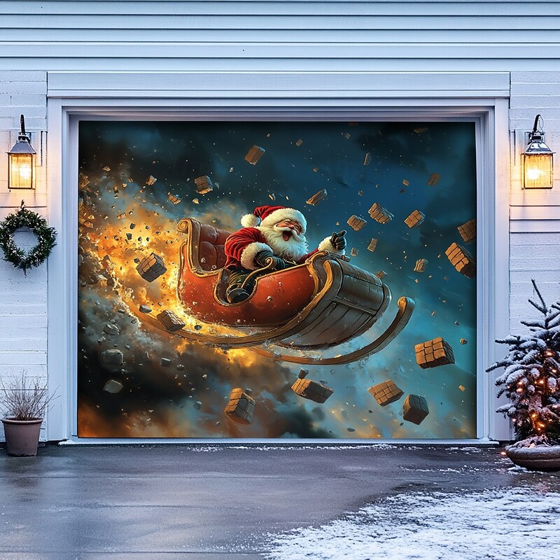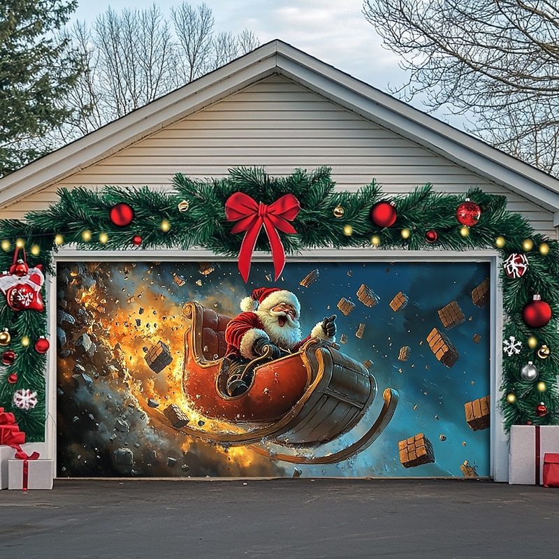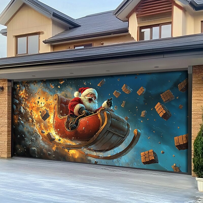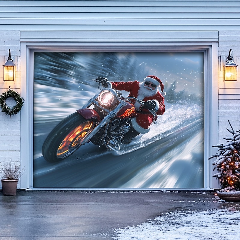 HOT ! Christmas Outdoor Garage Door Cover Xmas Banner Santa Claus Motorcycle Large Christmas Backdrop Decoration for Holiday Outdoor Garage Door Home Wall Decorations