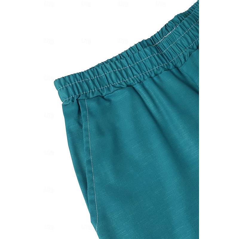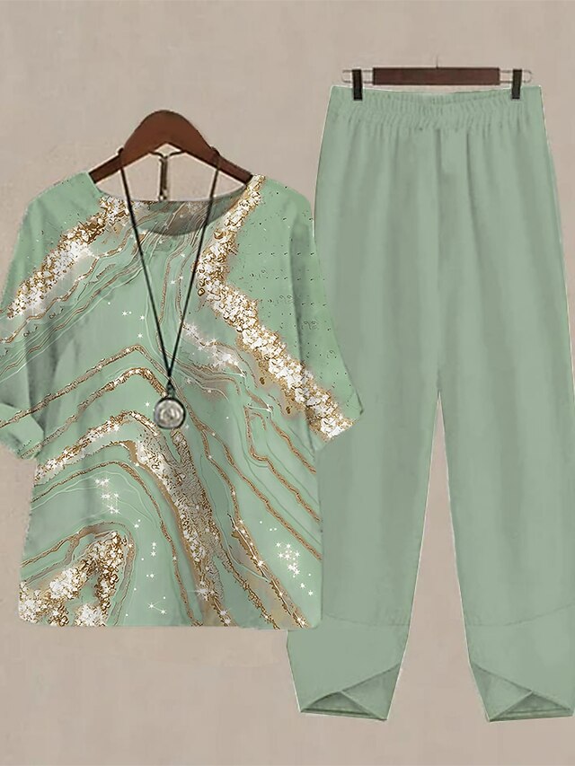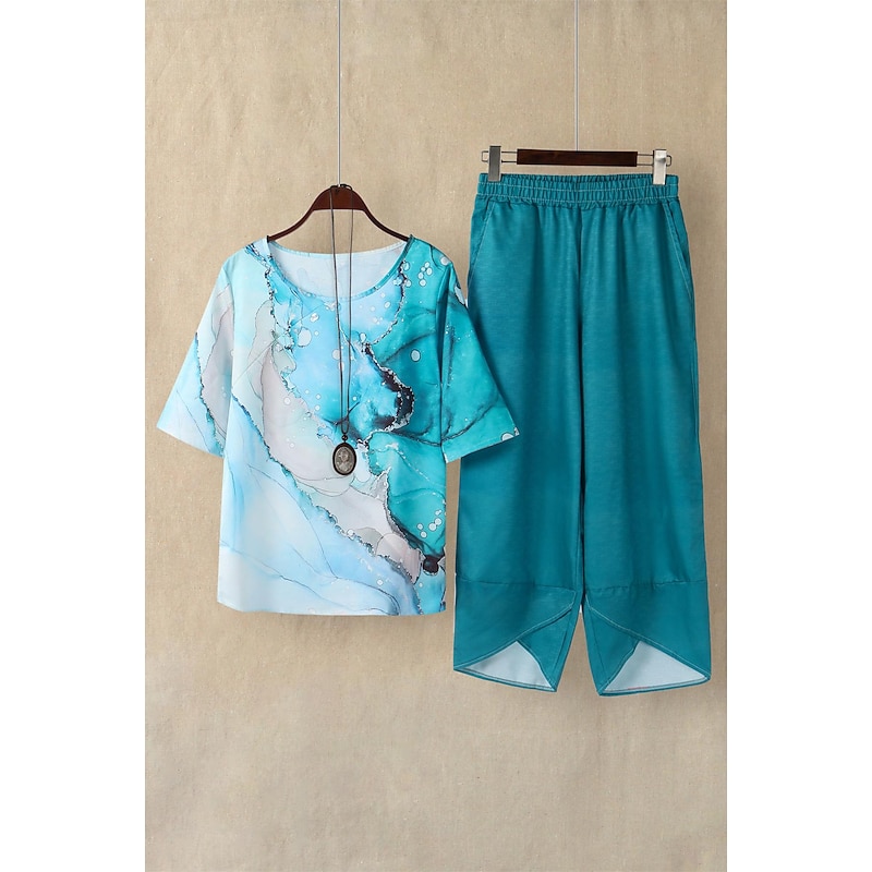 The ensemble features a regular fit that suits various body types. The top has a relaxed, casual fit with a round neckline and half sleeves, while the pants are designed with a straight-leg cut and an elastic waistband for convenience and adaptability.