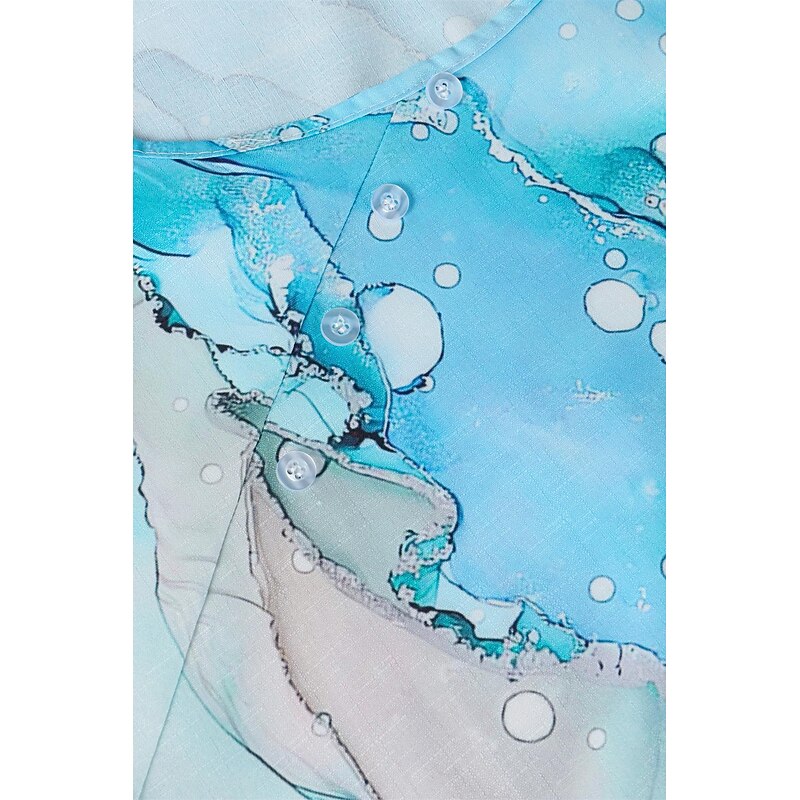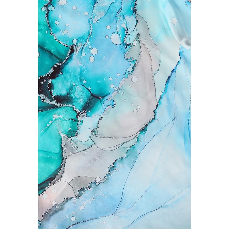 The top stands out with its captivating abstract marble-like pattern in gold and white on a soothing mint green background, lending a sense of elegance and modernity. This design is complemented by the clean, solid mint green of the pants, creating a harmonious and chic look.