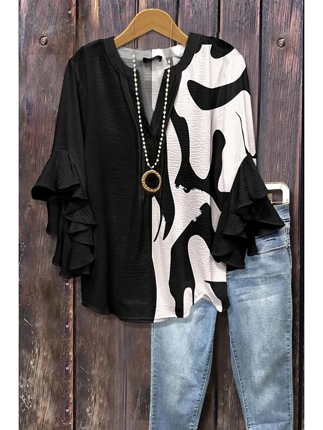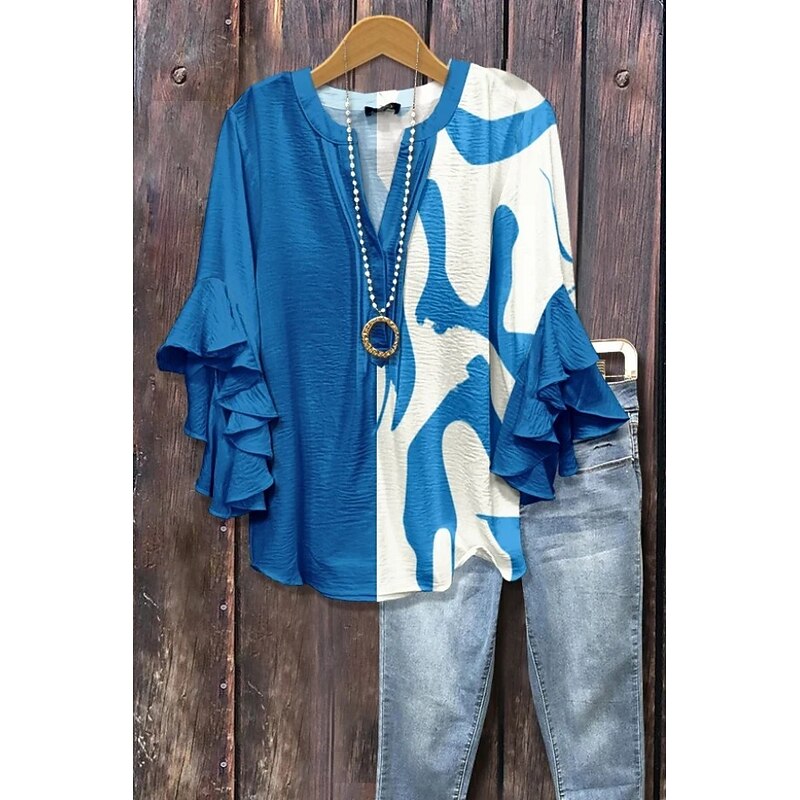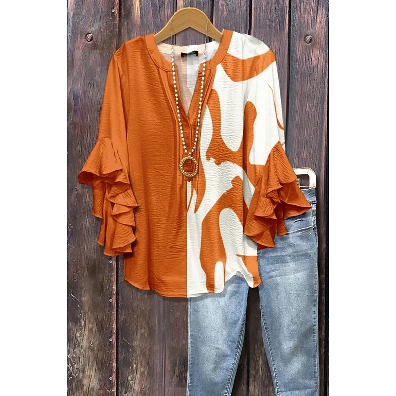 More information about Women's Blouse V Neck Floral Graphic Geometric Bohemia Vintage Daily 3/4 Length Sleeve Flutter Sleeve Regular Tops Daily Holiday Vacation Wear Ruffle Print Black Pink Blue Orange Brown Summer Spring