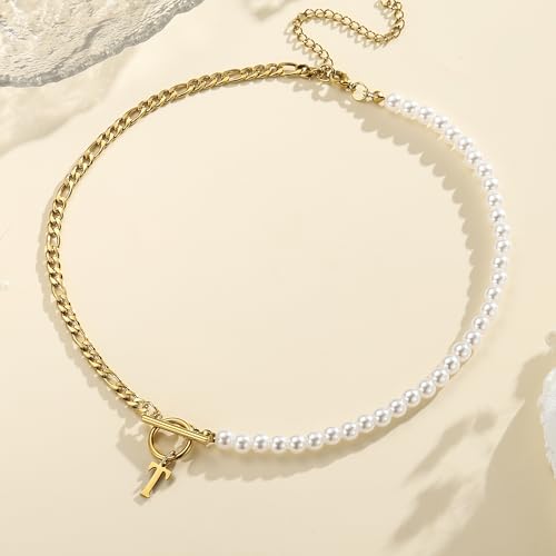 Pearl Initial Necklaces for Women 18K Gold Stainless Steel Letter A-Z Pendant Figaro Chain 16+3 Inch Jewelry Gift for Her 5