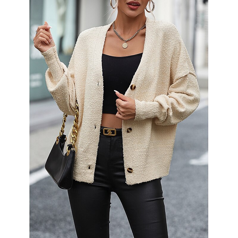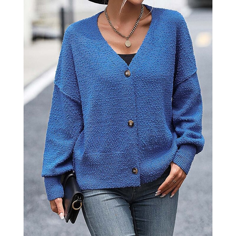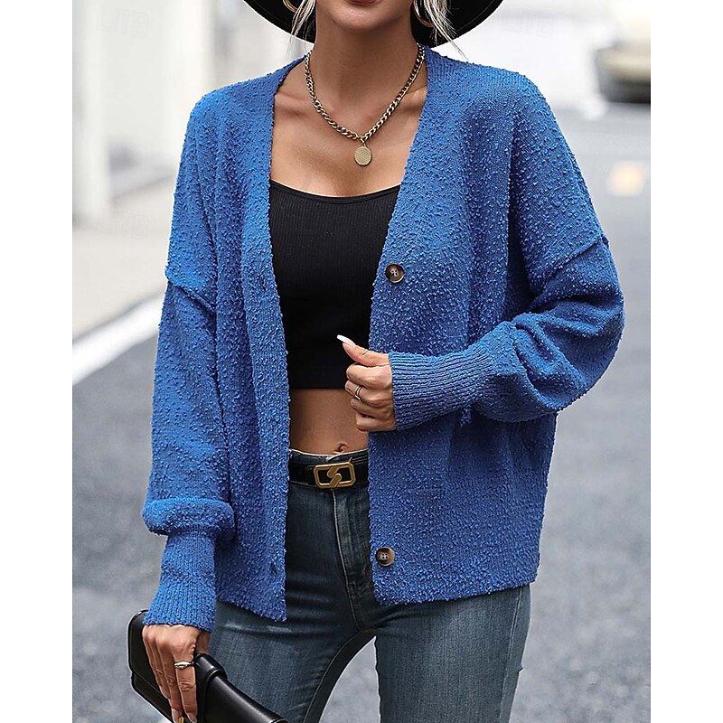 Highlights [Fabric] : Crafted from a micro-elastic, textured knit fabric, this women’s cardigan provides a cozy and warm feel, making it perfect for the fall and winter seasons. The solid color design adds a timeless touch to any outfit and ensures versatility for casual and daily wear. [Fit] : The cardigan features a loose fit, allowing for comfort and ease of movement. Its regular length makes it suitable for layering over various tops, providing both style and practicality. [Design Highlights] : This cardigan showcases a classic shirt collar and is adorned with oversized buttons down the front, adding a chic and sophisticated touch. The long sleeves enhance warmth, while the knitted texture brings out a distinctive and elegant look. [Occasions] : Ideal for work, home, or daily casual settings, this cardigan fits a variety of occasions. Whether you're staying cozy at home or heading out for a casual day at the office, its stylish design ensures you stay fashionable throughout the day. [Size Range] : Available in sizes S, M, and L, this cardigan accommodates a range of body types, ensuring a comfortable fit for everyone. Choose from a selection of colors including blue, white, and red to suit your personal style preferences.