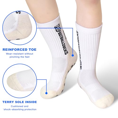 • NON-SLIP GRIPS DESIGN: Featuring non-slip gel dots on the bottom of the kid grip socks, these soccer socks for youth help prevent your child's feet from sliding inside their shoes or other slipping place, enhancing footwork and maximizing their athletic potential.