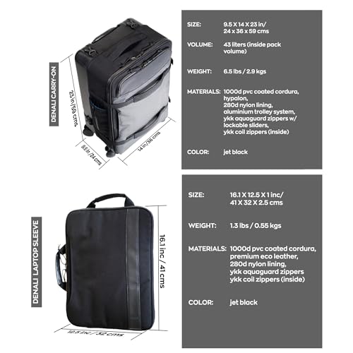 • TOP NOTCH QUALITY: Taskin Denali carry-on is made from aircraft grade aluminum trolly; smooth, rubberized asymmetric wheels; YKK AquaGuard waterproof zippers; 1000D PVC coated waterproof Cordura.