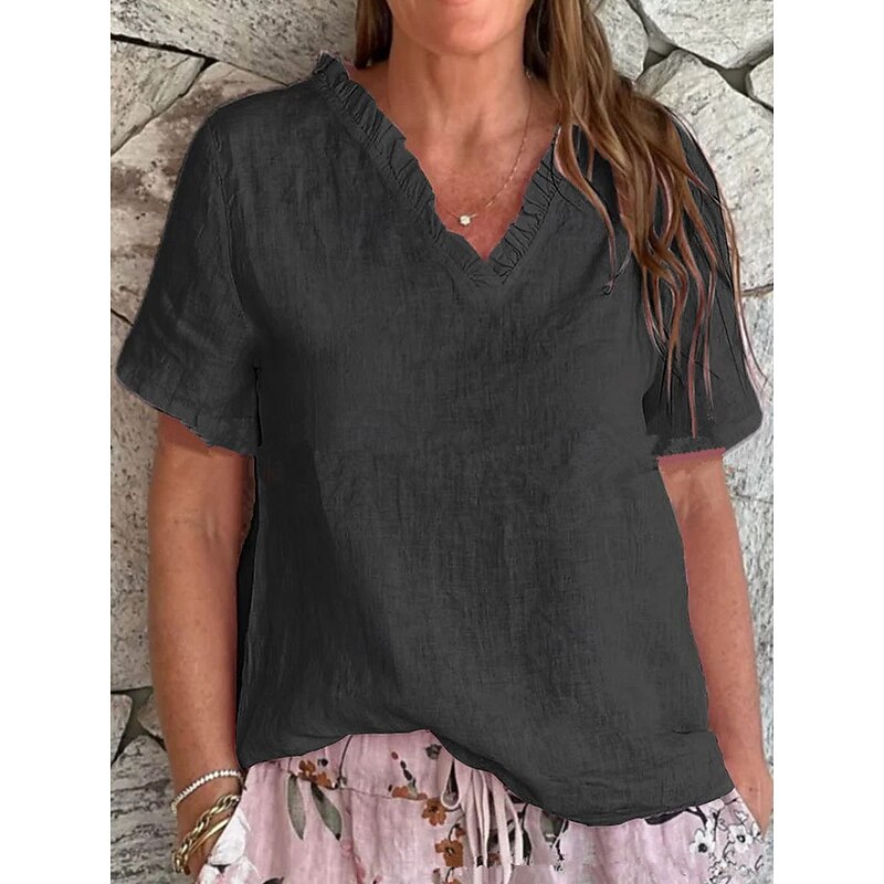 More information about Women's Cotton Linen Blouse Solid Color Elegant Casual Short Sleeve V Neck Regular Tops Daily Holiday Ruffle Black White Yellow Pink Blue Summer Spring