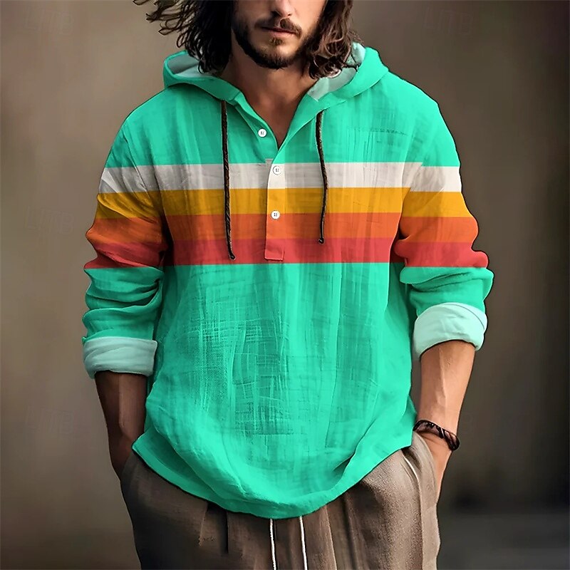 Men's Shirt Popover Shirt Summer Shirt Casual Shirt Beach Shirt Pink Red Blue Sky Blue Orange Long Sleeve Stripes Hooded Vacation Hawaiian Buttons Clothing Apparel Polyester Fashion Casual Comfortable 11