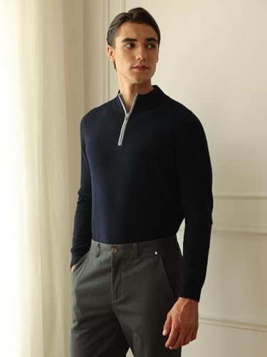 Quarter-Zip 100% Merino Wool Sweater for Men Mock Neck Pullover Contrast Trim Casual Long Sleeve Knit Tops 5