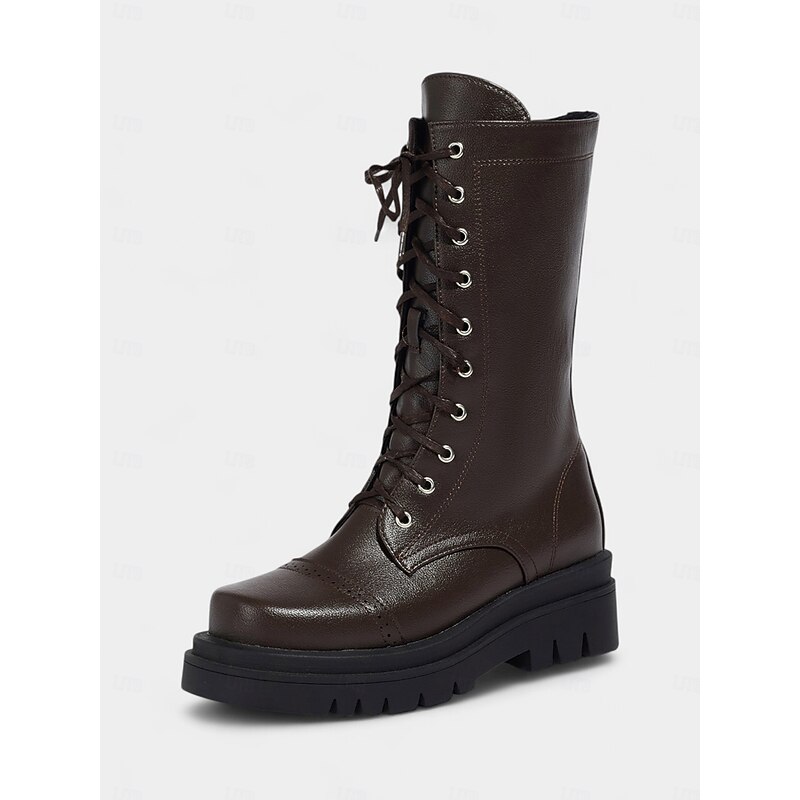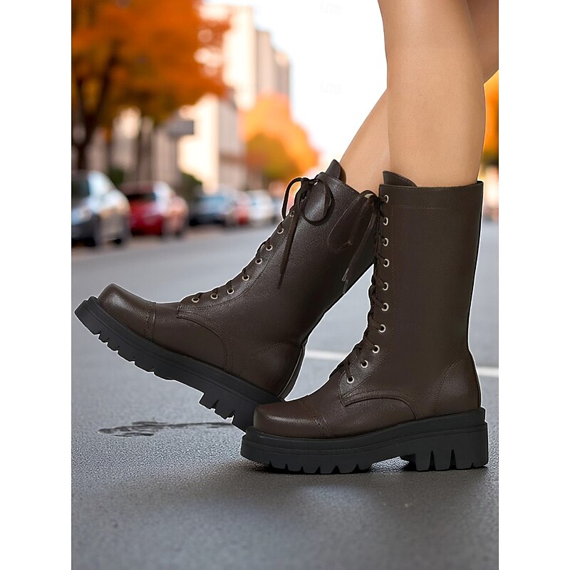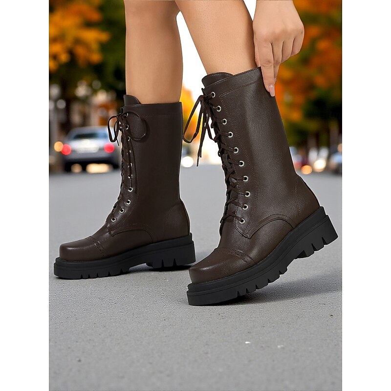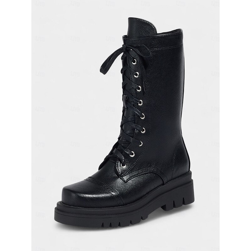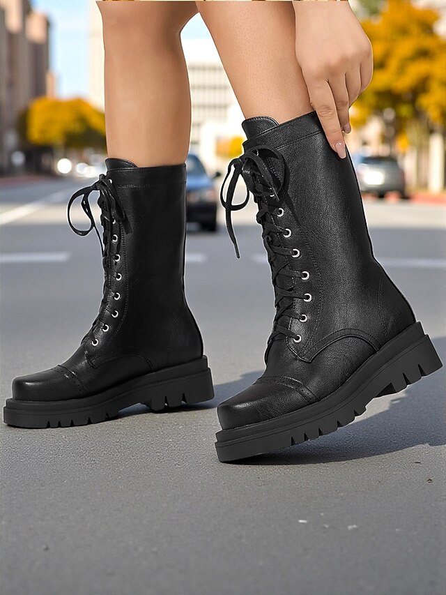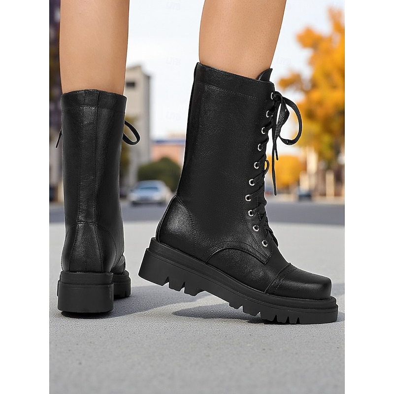 Women's Black Faux Leather Lace-Up Combat Boots – Chunky Sole Military Style Mid-Calf Boots for Fall and Winter Streetwear,Casual Outings, Urban Fashion 1