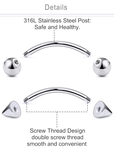 • VALUE PACK: One Order Including 8 Pieces Curved Barbells Eyebrow Piercing Jewelry in 2 Styles(Ball and Spike, Each Style 4 Pieces). It Comes in a Velvet Pouch and the Different Sizes Make it Super Easy to Figure Out What You need to Use.