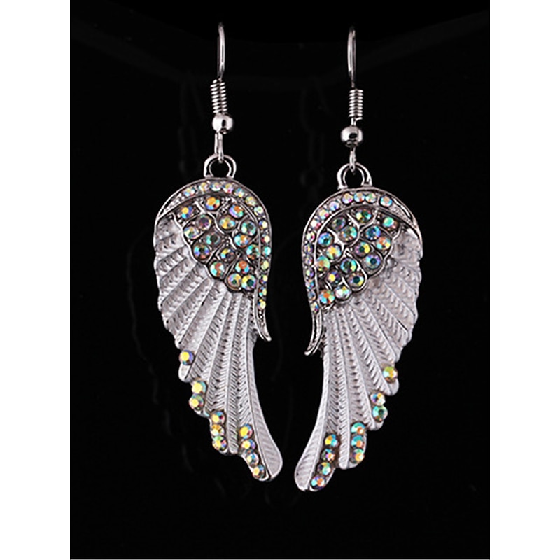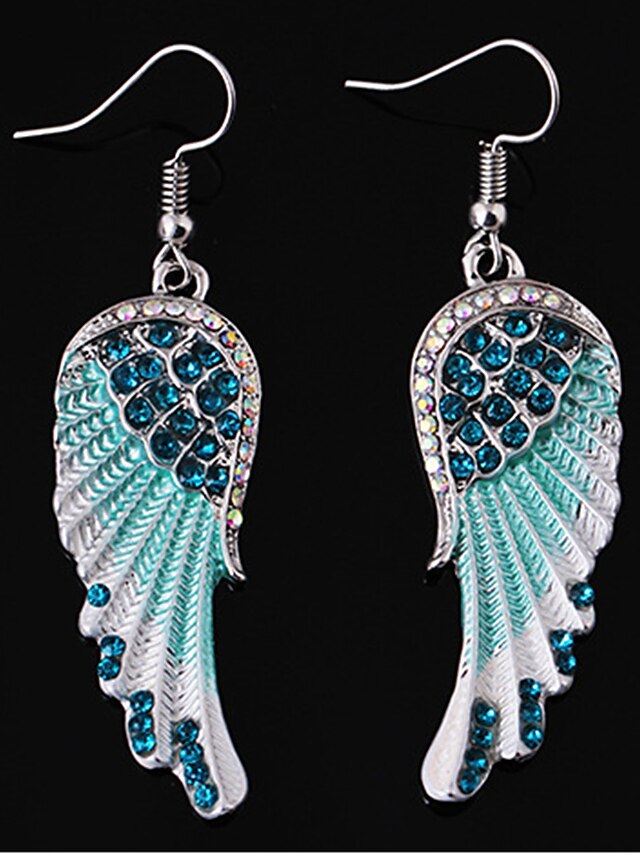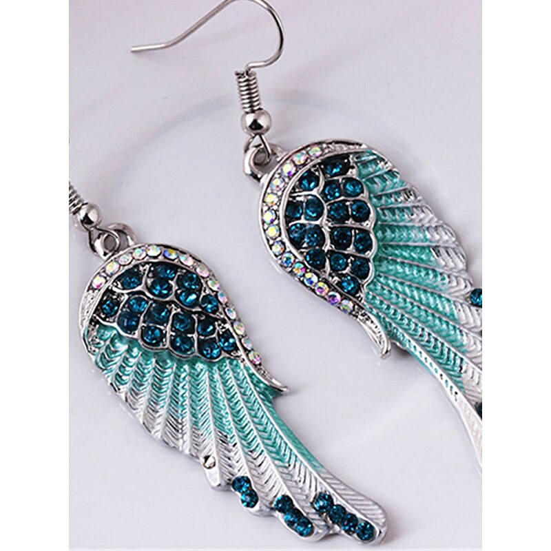 Highlights [Fabric and Material] : Crafted from a high-quality silver-toned alloy, these earrings boast a sturdy yet lightweight feel. The centerpiece of the design features a collection of sparkling blue rhinestones that bring a radiant and elegant touch to the piece. [Design and Style] : The earrings feature an enchanting wing design with intricate feather detailing that transitions beautifully from silver to turquoise, creating a stunning gradient effect. The contemporary style is complemented by a touch of whimsy, making these earrings a unique fashion statement. [Design Highlights] : The wing motif is accentuated by the shimmering rhinestones, offering an ethereal and glamorous appeal. With a design focused on comfort, these earrings are lightweight and easy to wear, featuring convenient hooks for secure attachment. [Occasions] : Ideal for daily wear, street style, holiday festivities, or outdoor gatherings, these earrings add a touch of fantasy to both casual and special occasions. Their versatile style makes them suitable for a range of events throughout all seasons. [Size Notice] : Available in a one-size-fits-all design, these earrings are perfect for adult women seeking a stylish and modern accessory to complete their look.