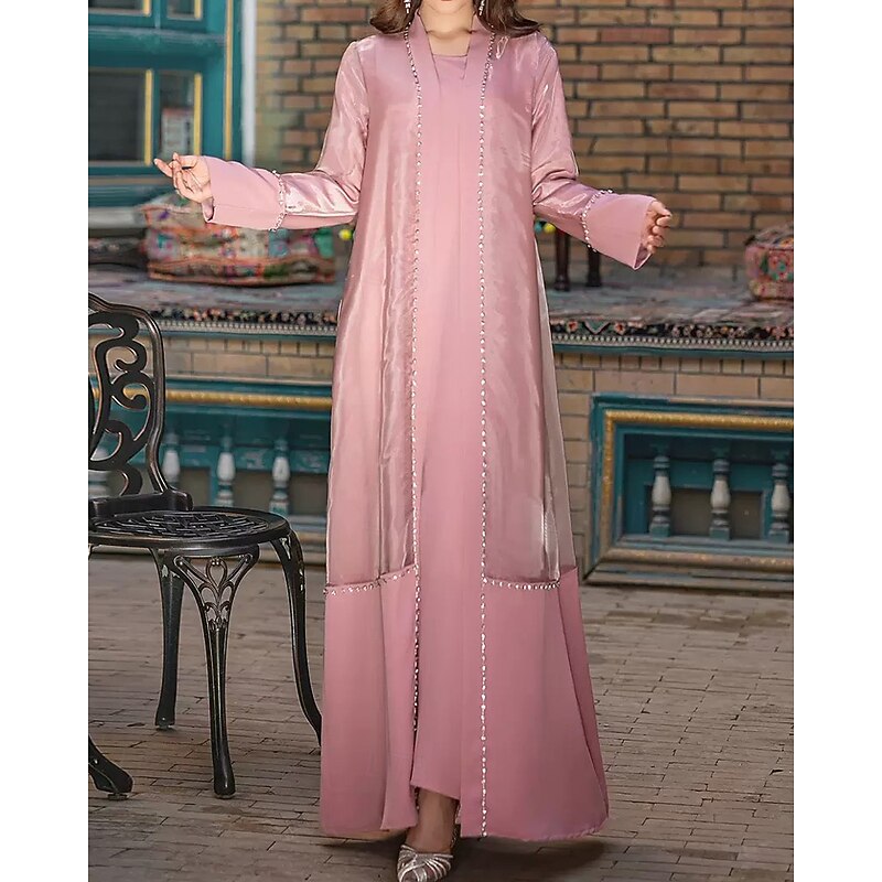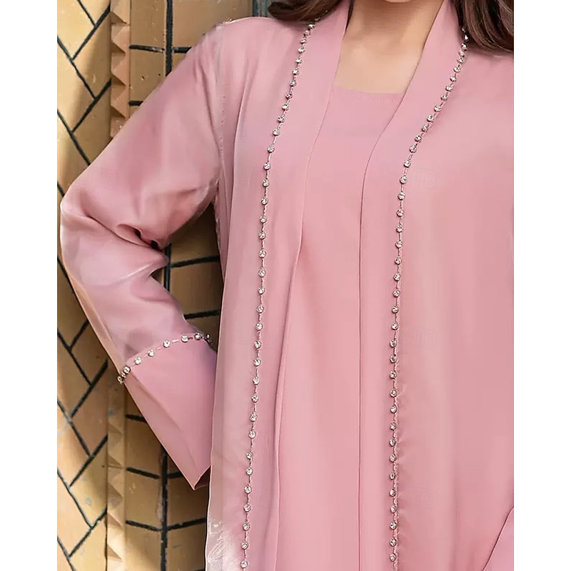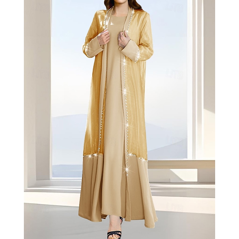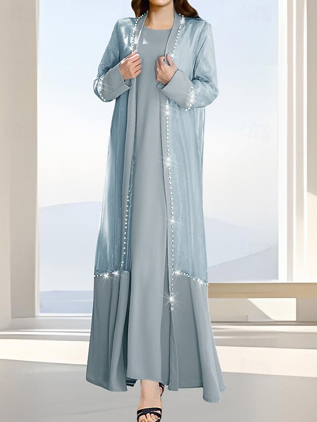 More information about Two Piece A-Line Mother of the Bride Dress Formal Elegant Simple Luxurious Boat Neck Floor Length Satin Organza Long Sleeve with Crystals