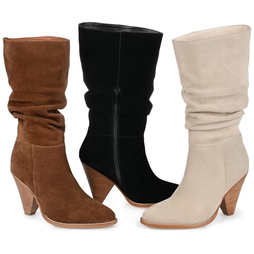 HOT ! Journee Collection Signature Womens Genuine Leather Syrinn Slouch Suede Mid Calf Boots Padded Stacked Wood Heel Almond Toe
