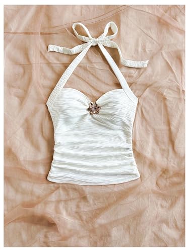 • Features: Summer vacation tank top for girls, ruched, metal decor, halter neck, sleeveless, open back, textured