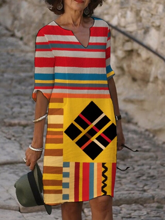 More information about Women's Midi Dress Casual Dress Print Dress Vintage Daily Beach Weekend Regular Fit Geometric Color Block 3/4 Length Sleeve Crew Neck Yellow Purple Fuchsia Orange Summer Spring Fall Autumn