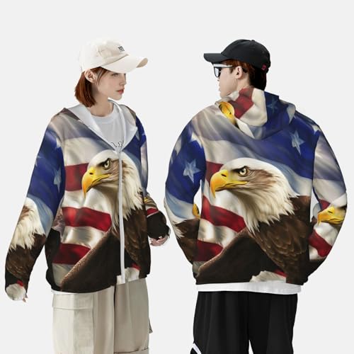 HOT ! Men's Sun Protection Hoodie UPF 50+ American USA Flag Eagle Art Rash Guard Long Sleeve Women's Sun Shirts Lightweight