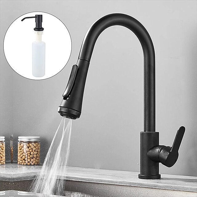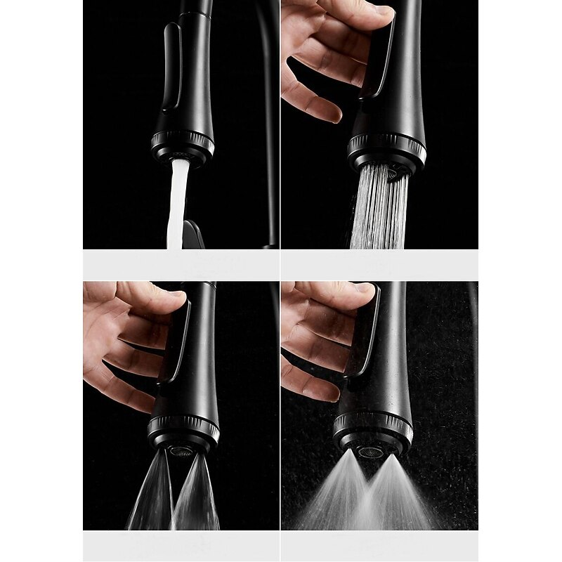 Kitchen Faucet with Sprayer,Matte Black Brass 4-Function Single Handle One Hole Button Design Pull-out / Pull-down Centerset Contemporary Kitchen Taps(with Soap Dispenser) 1