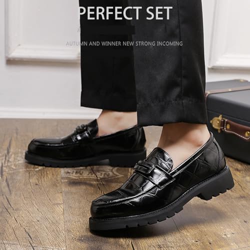 Sole material: RubberOuter material: Faux LeatherClosure type: Pull-OnWater resistance level: Waterproof【High-quality materials】Men's patent leather printed thick-soled loafers are made of comfortable PU leather fabric, with excellent material and good flexibility. Bright appearance, giving people a fashionable and noble feeling, showing men's taste.【Non-slip sole】The rubber sole of men's loafers is flexible, lightweight, wear-resistant, provides good cushioning, increases shock absorption, and relieves foot fatigue. The non-slip convex sole greatly increases grip and friction. The thick heel can comfortably support your feet, so you won't feel tired even if you walk all day.【Stable and Comfortable】The men's fashion loafers are simple in design and adopt a slip-on design, which is easy and quick to put on and take off, eliminating the trouble of tying shoelaces. The comfortable and soft lining and insole, and the lightweight structure keep your feet odor-free and dry every day, and are not easy to wear your feet.【Fashion Style】Men's casual loafers adopt round toe design, which fits the foot shape and can better relax the toes. The patent leather printed upper is full of hardcore power, full of momentum, classic and fashionable. The heel height of about 1.18 inches is used to increase the height and lengthen the legs. The slip-on design is easy to put on and take off. The leather is smooth and comfortable, personalized and practical.【Applicable Occasions】This men's slip-on loafer is contemporary and simple, very suitable for office, business, party, work, shopping, leisure and other occasions, it is your ideal choice. Mature and stable, it can be matched with most of your formal wear, jeans and other clothing. Perfect for everyday use. superior materials and excellent craftsmanship ensure long-lasting durability.