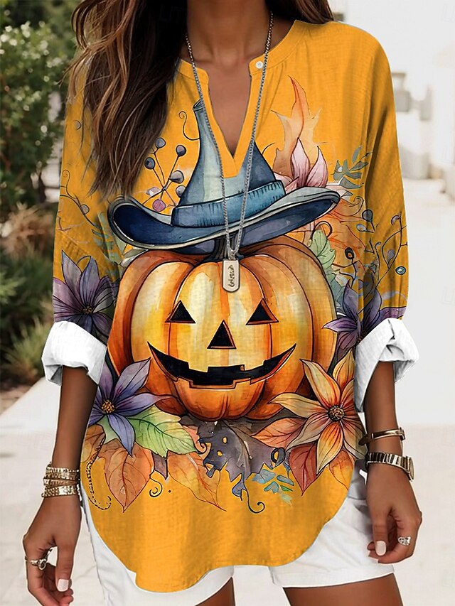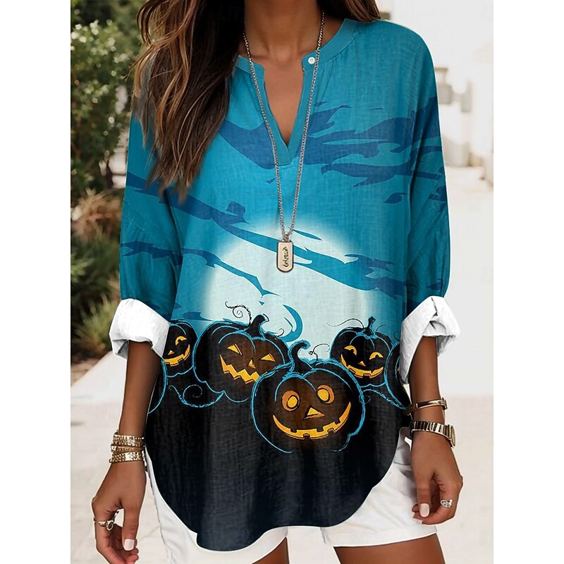 More information about Halloween Women's Blouse Pumpkin Print Tunic V Neck Long Sleeve Boho Casual Tops Graphic Vintage Stylish Regular Tops Daily Print Black Blue Dusty Blue Purple Orange Fall