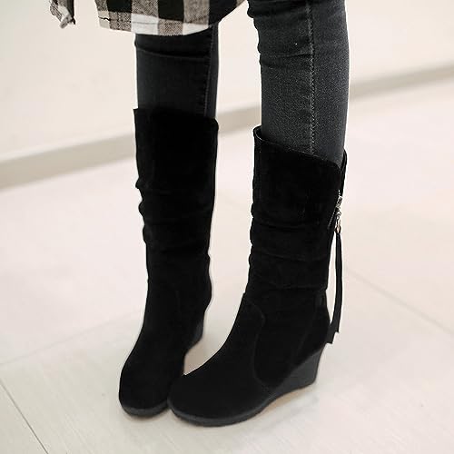 • Design: Wedge heel, providing you with stability and comfort. Medium shoe width. Slip-on closure. Rubber sole, durable and anti-slip. Decorative tassel zipper can adjust the elasticity around the boot's circumference makes it easy to put on and take off.