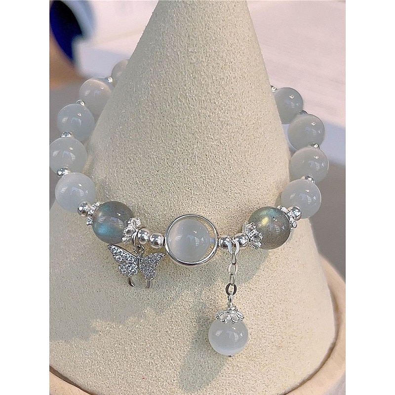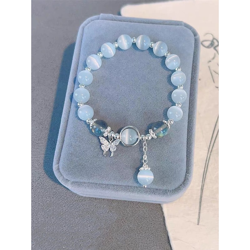 Highlights Bracelet Description [Fabric and Material] : Crafted from a high-quality alloy, this bracelet features glossy beads resembling blue chalcedony, offering both durability and striking visual appeal. The combination of lustrous materials ensures a timeless look that complements any outfit. [Design and Style] : With a modern and contemporary design, the bracelet is adorned with smooth round beads, evenly spaced with shiny silver-toned spacer beads. A delicate butterfly charm, detailed with shimmering stones, adds whimsy and elegance, while a larger focal bead framed by ornate silver caps is the centerpiece. A sophisticated dangling bead on a silver chain adds a whimsical flair. [Design Highlights] : The intricate detailing of the butterfly charm and the ornate silver caps around the focal bead elevate the bracelet's aesthetic. The dangling bead, attached with a thin silver chain to the centerpiece, injects a playful touch into the elegant design, making it versatile for various occasions. [Occasions] : Perfect for a wide range of settings—from daily outings and casual street strolls to holidays and weekends in the park. This bracelet seamlessly enhances both casual and formal ensembles, making it a versatile addition to any jewelry collection. [Size Notice] : The bracelet is available in a one-size-fits-all design, ensuring a comfortable and stylish fit for adult women. Its adaptability makes it suitable for any occasion, providing a blend of elegance and practicality.